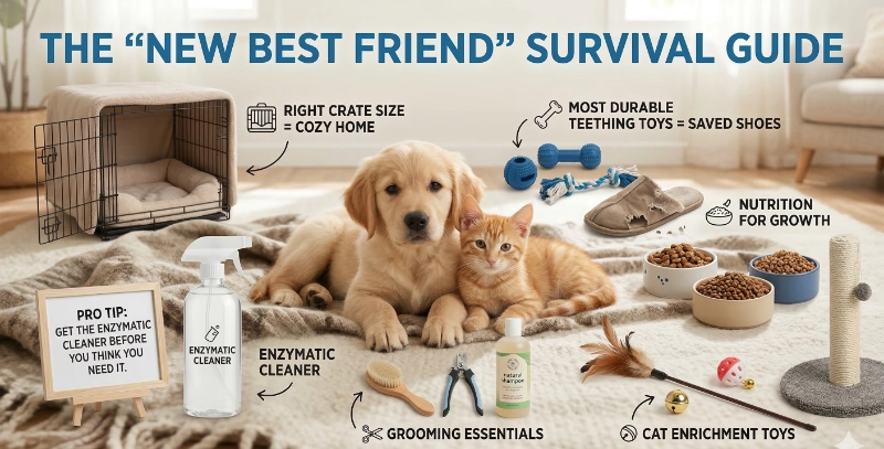 Bringing home a new puppy or kitten is a whirlwind of joy and... chewed-up shoes. To help you survive the first week, we’ve rounded up the "Must-Haves." From the right crate size to the most durable teething toys, we’ll help you set your new family member up for success. Pro tip: Get the enzymatic cleaner before you think you need it.